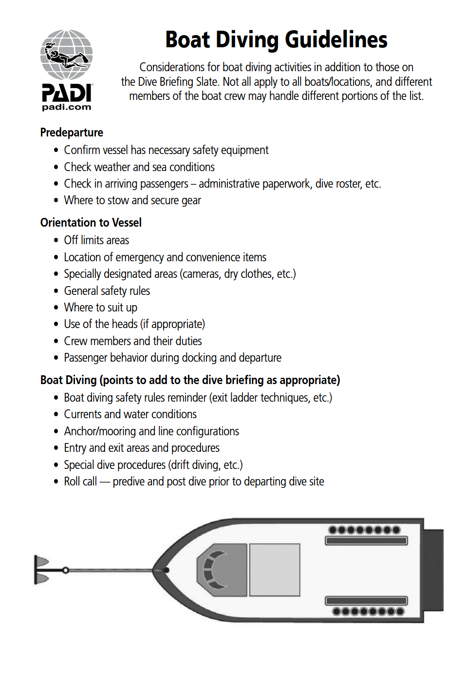 Dive Procedures: These include the course, max depth, air reserve, safety stop, and any special techniques we are going to use.